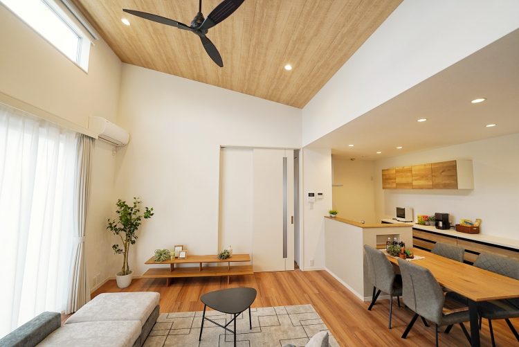 高い天井は空間を広く見せる効果がありますが、同時に空気循環が難しいデメリットも持っています。写真のようにシーリンファンを設置すれば、エアコン効率が良くなるためおすすめです。テレビの後ろには、グレーのアクセントクロスを取り入れました。木目との組み合わせが面白く、長く過ごしていても飽きのこない家になるでしょう。