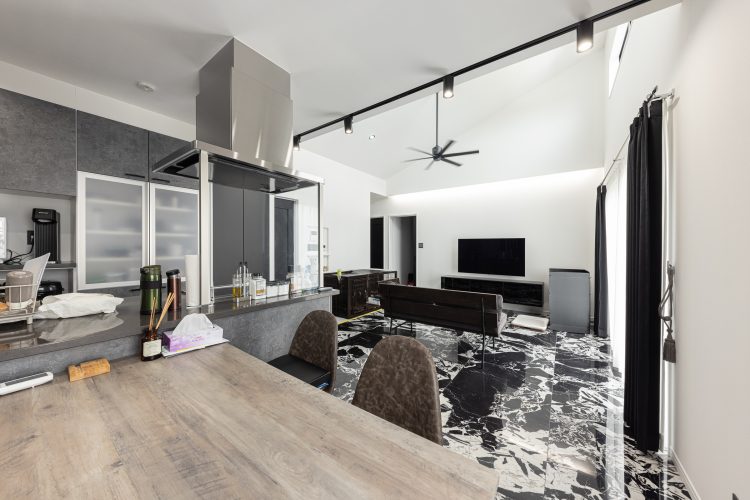 こちらの平屋事例は、リビングダイニングを白の壁に白と黒の大理石の床、吹き抜けには黒いシーリングファンを取り付けてモダンシックのイメージにこだわりました。開口部を大きく取っているので、外からの日差しがリビングにたっぷり降り注ぎます。