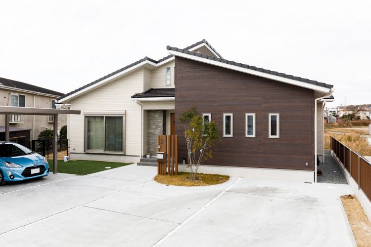 こちらの事例の特徴は、洋風の外観です。足腰に負担のかかる階段がない平屋に憧れがあるものの、和風ではなく他の家と被らないような洋風の家を希望されたオーナー様ご夫婦。