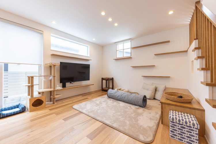 このお住まいには、3匹の猫たちと暮らすご夫婦の「ペットも快適に暮らせる家にしたい」という想いが込められています。リビングの壁面にはキャットウォークを設置し、猫たちが自由に動き回れる遊び場を確保。運動不足やストレスの軽減にもつながり、人も動物も心地よく過ごせる空間に仕上がりました。