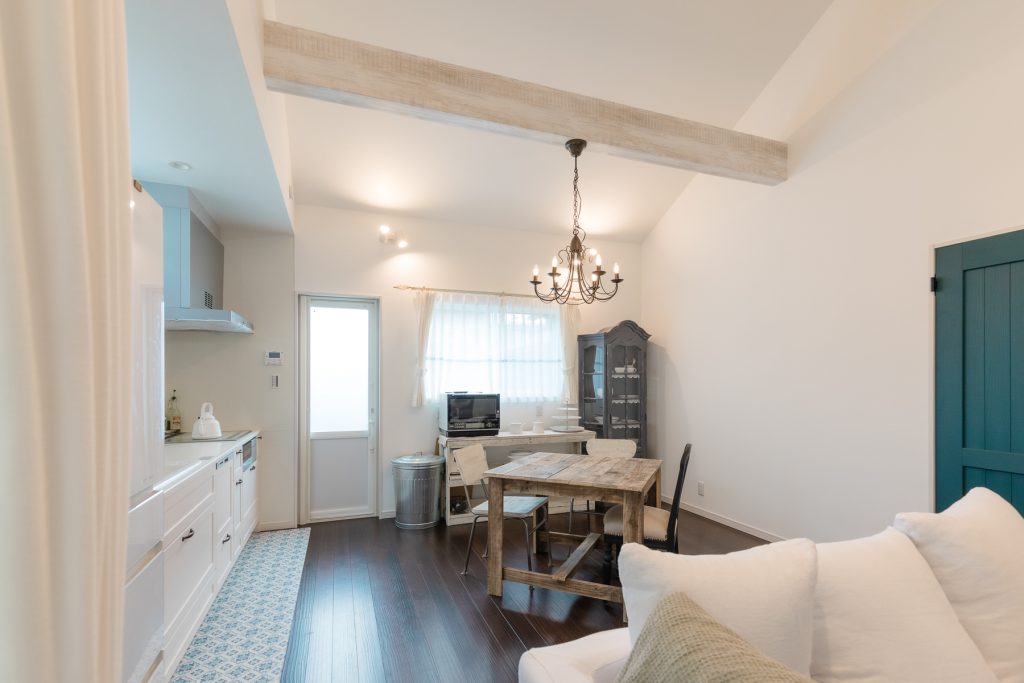 リビングダイニングは、吹き抜けにして開放感のある印象です。開口部を大きく取っているため、昼間は外からの日差しがたっぷりリビングに降り注ぎます。白を基調とした明るい空間に、グリーンの扉がアクセントとなっています。