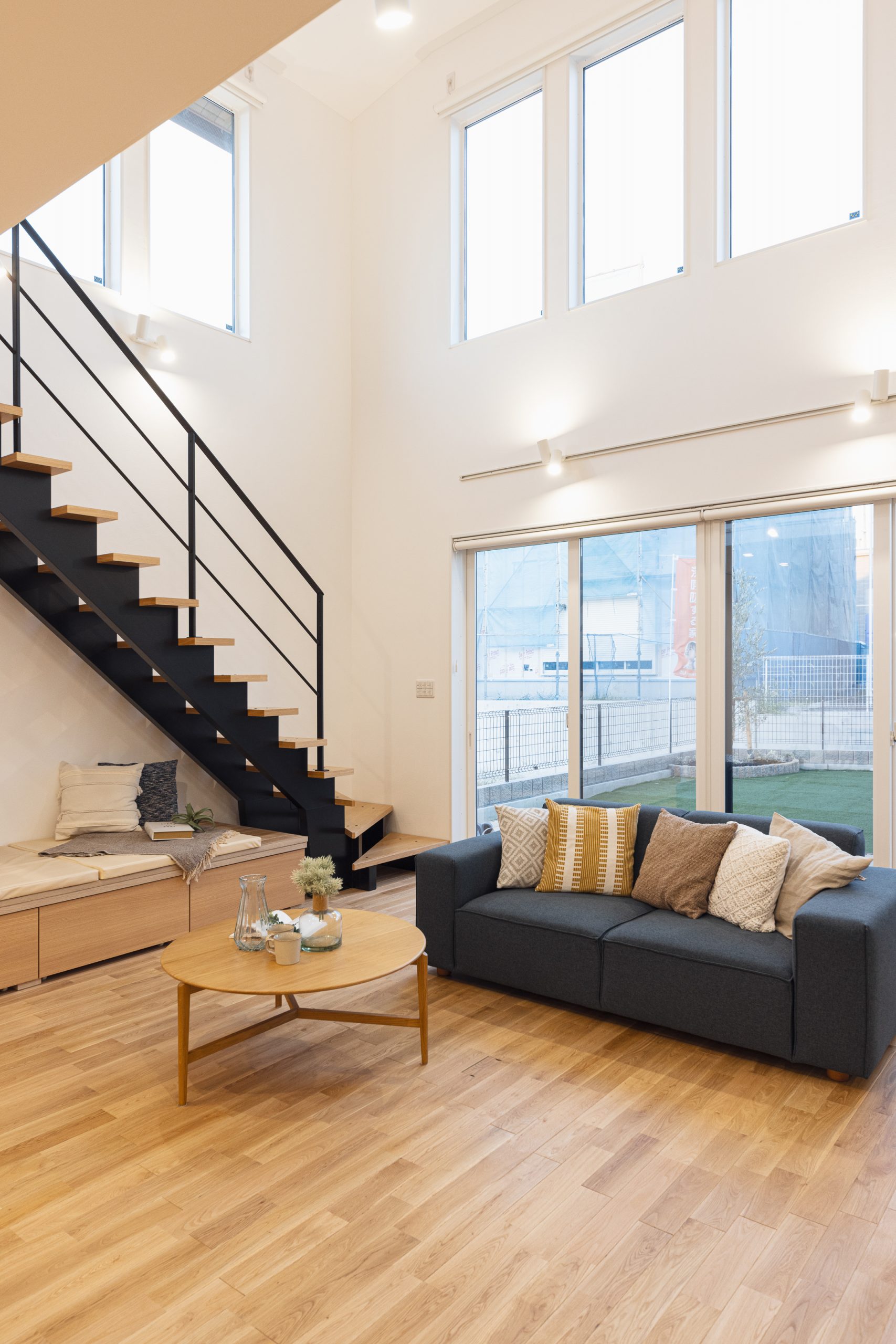 - 明るさ:吹き抜けリビングは自然光をたくさん取り入れることができます。これにより、室内が明るくなり、心地よい生活空間を作り出すことができます。