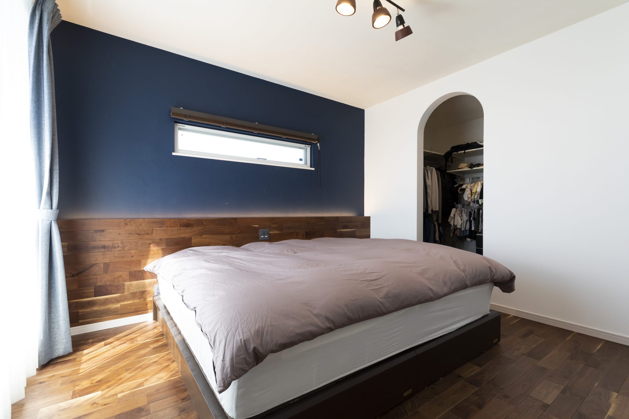 青い漆喰のアクセントカラーを使用した和モダンの住宅