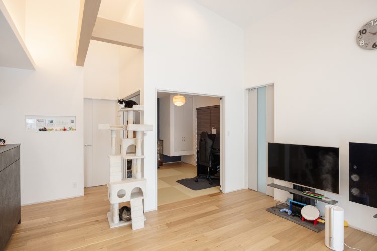 勾配天井の開放感あるリビングに、キャットタワーが映える愛猫との暮らしを楽しむ平屋。室内には畳スペースやワークルームも配置され、家族とペットがそれぞれ快適に過ごせる工夫が満載です。白と木目を基調にした柔らかな空間デザインが、心地よい毎日を演出します。