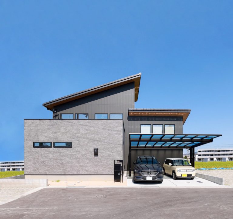 外観はリズム感のある複数のブロックを組み合わせたような形状を採用し、大きな片流れ屋根が目を惹くデザインを設計しました。耐久性が強く長持ちするように、素材はガルバリウムを使用しています。色合いはモノトーンで統一し、スッキリとモダンな印象です。