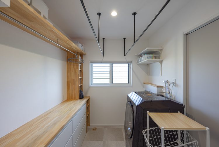 ランドリー・収納・動線すべてが整った、機能美あふれる回遊型の家事室事例です。乾燥機やアイロン台も設置できる広さがあり、洗濯から収納までがこの一室で完結。天井の物干しバーや窓からの自然光も、家事効率と快適さを両立しています。