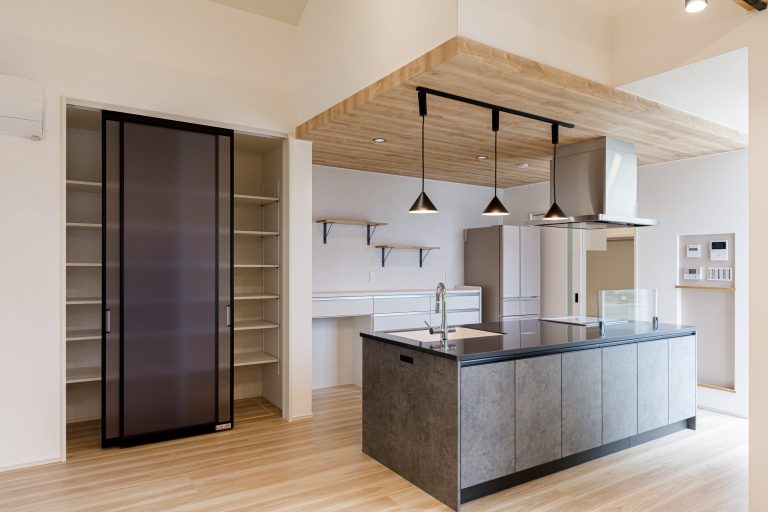 2階建てに比べて平屋は、家事動線が短くて済む、家族のコミュニケーションが取りやすいなど、平屋ならではの特性を活かして遊び心たっぷりの住まいです。建物の外観は、シックなグレーを基調にし、落ち着いた印象で住宅が中庭を囲むような形になっています。子ども部屋は、広く使えるように2部屋分のスペースを使って1部屋に仕上げました。