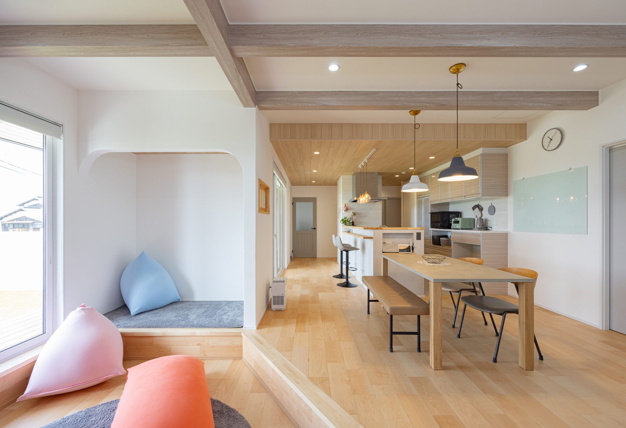 ピットリビングとデザインニッチがあるナチュラルテイストな平屋の建築実例はこちら