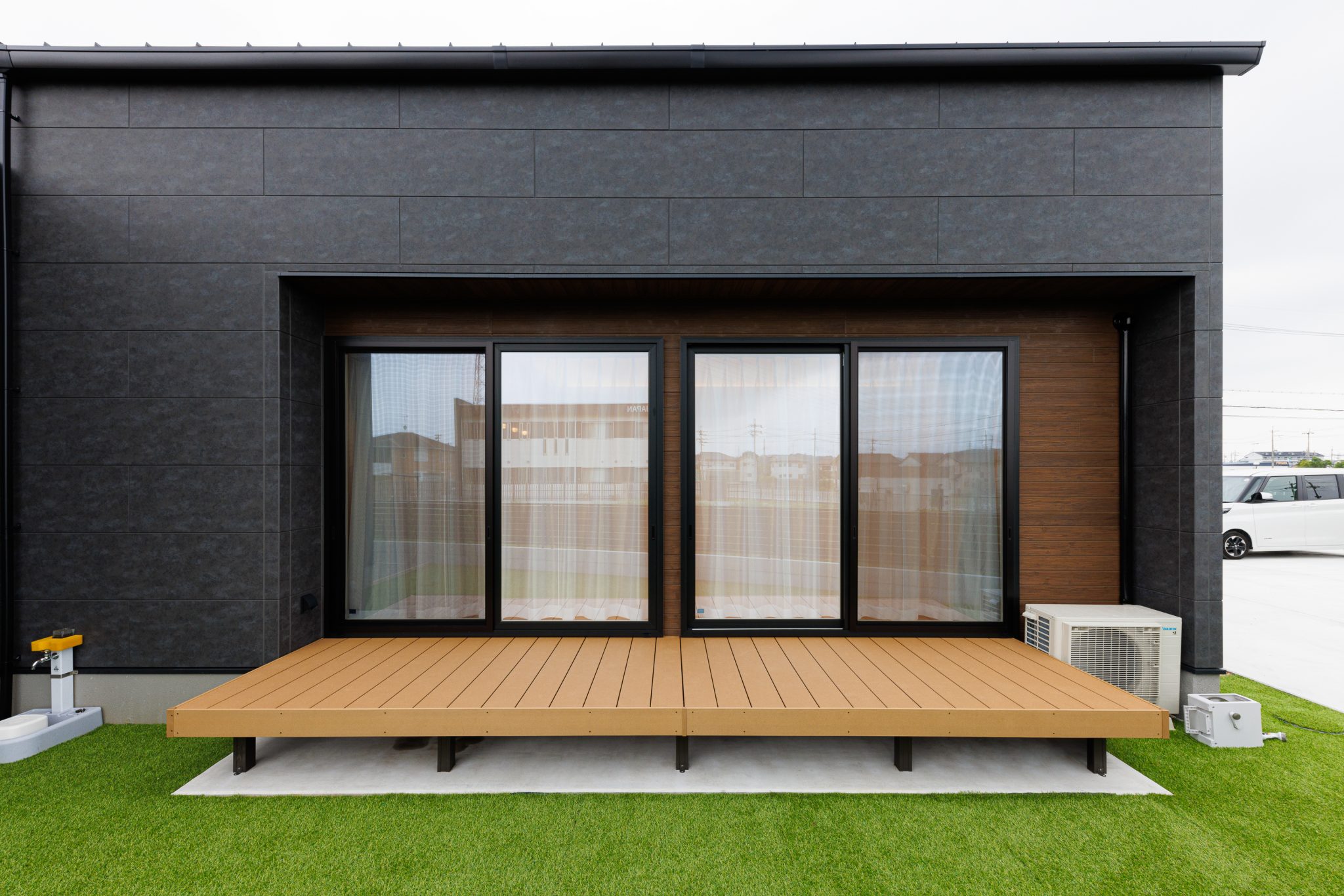 育児と家事の負担を減らすために、玄関の土間収納や、家族みんなで楽しめる庭付きテラスを設けた平屋です。変形地に建つ、黒を基調にしたシックでモダンな外観が特徴的です。LDK横に庭付きテラスを設置することで、家事をしていても子どもやペットが見えるため、安心・安全に楽しめるでしょう。