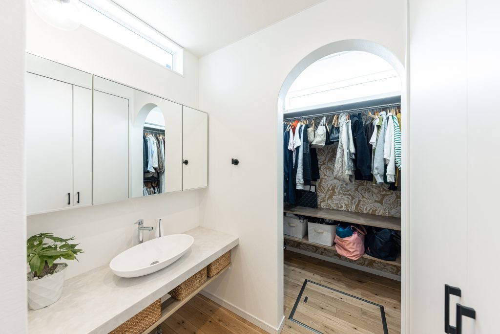 リビング横の扉を開けると、ナチュラルテイストな清潔感のある洗面スペースにつながります。勝手口からの明るい日差しが入る、気持ちのいい空間です。