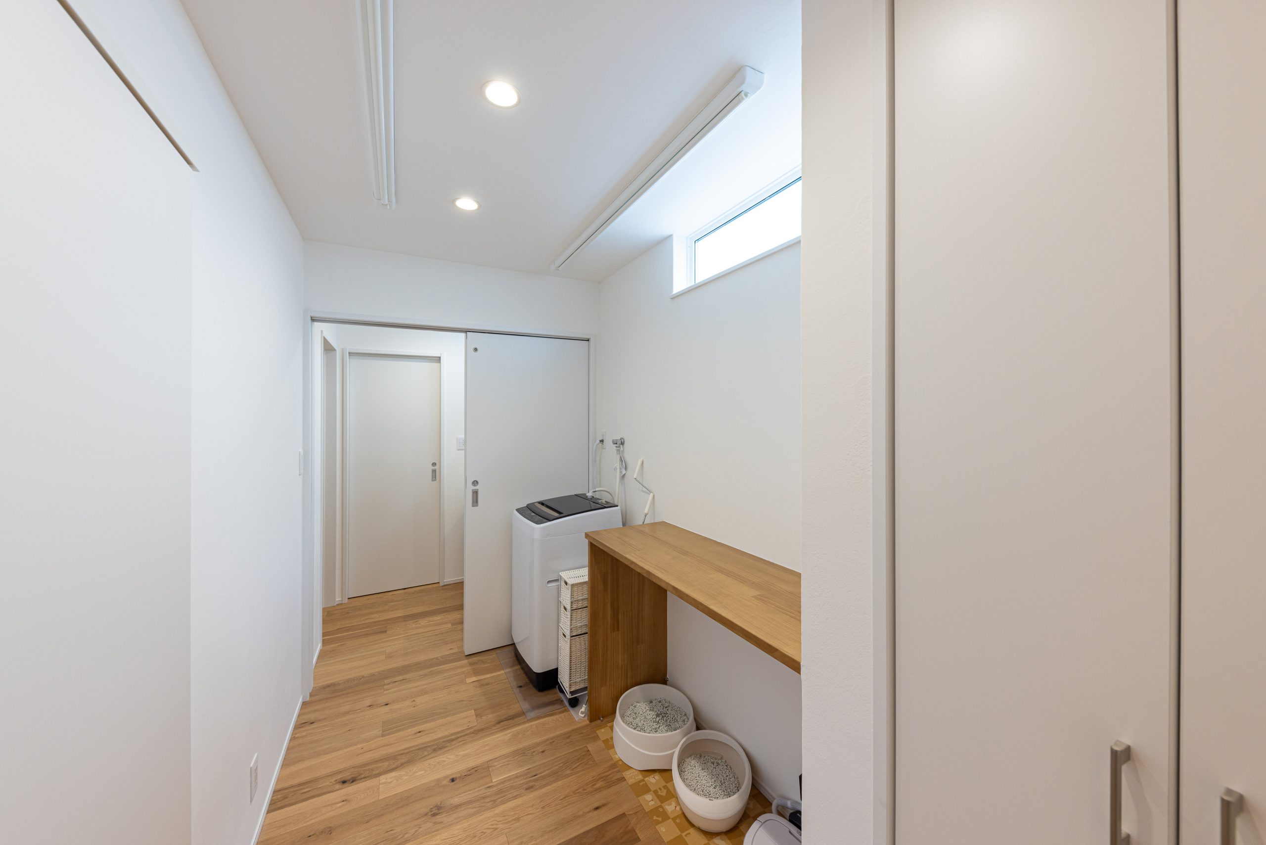 茶と白の温かい外観が特徴の平屋住宅は、広いリビングや効率的な動線、充実した収納が魅力です。効率的に家事ができるよう動線にこだわり、浴室の脱衣所には広いスペースを確保しました。作業台やアイロン、収納棚を設置して洗濯工程での移動の手間を省いています。