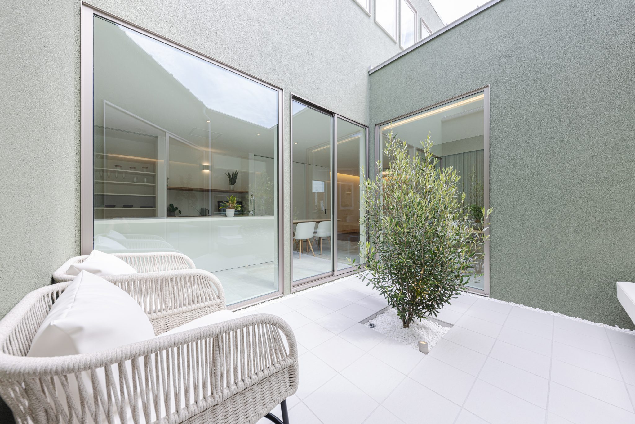 広すぎず心地よいサイズ感の中庭には、くつろぎのチェアを設置。室内で過ごすご家族の様子を感じながら、自然の光と風に包まれてリラックスできる、癒やしの空間となっています。