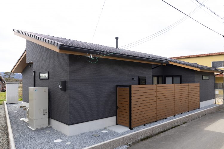 のどかな自然に囲まれた、洗練されたデザインの平屋住宅です。リビングに設置した薪ストーブの煙突が屋根からのぞく、スタイリッシュなログハウス風のつくりになっています。グレーを基調とした外観も、落ち着いた雰囲気を演出しています。