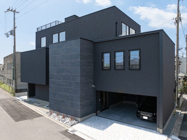 黒い外壁に重厚感があり、凹凸のあるデザインが印象的な住宅です。3階建て+屋上の構造と、インパクトを放つ存在感があります。また、車が2台駐められるインナーガレージも設置し、風雨や防犯面も考慮されています。