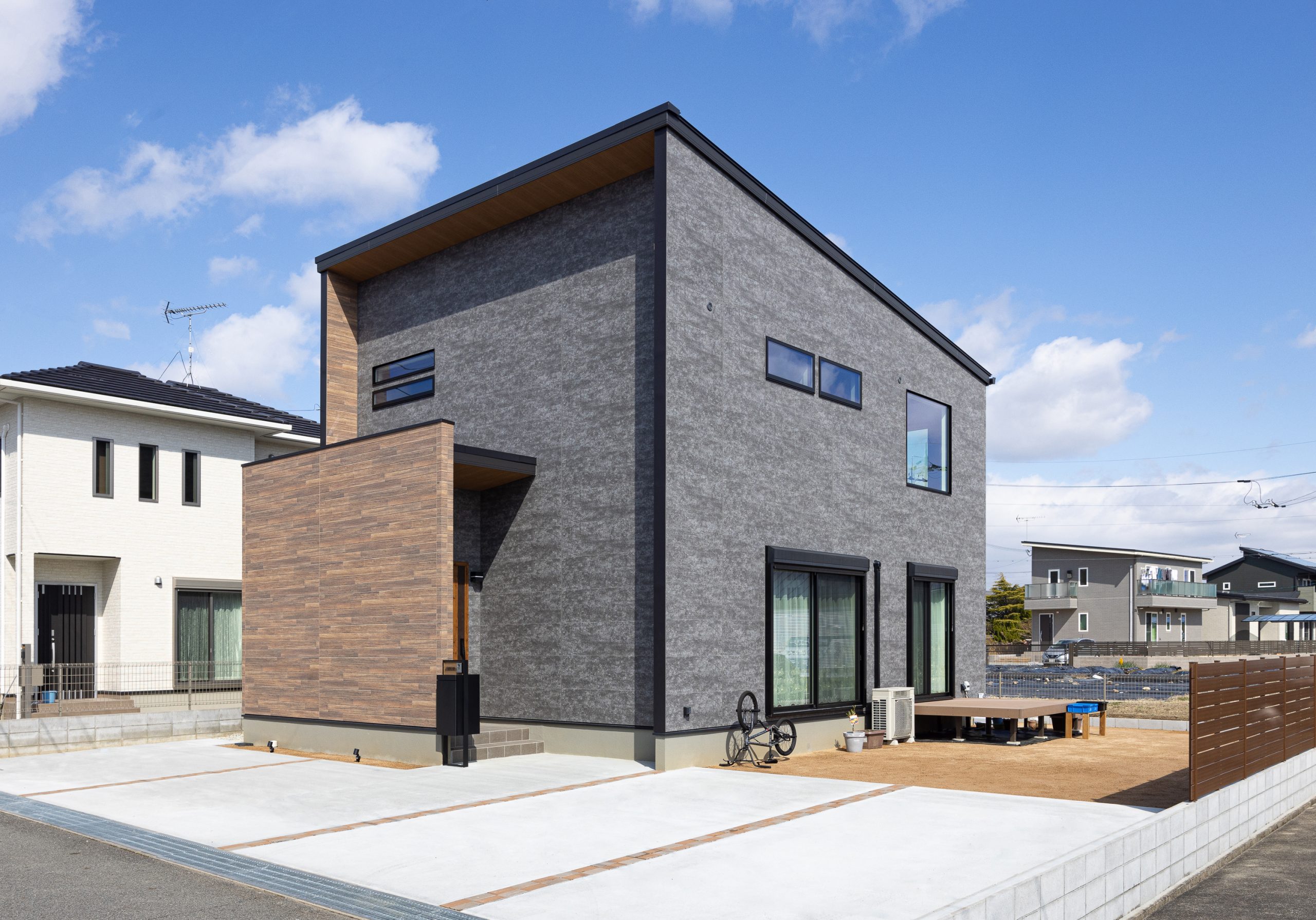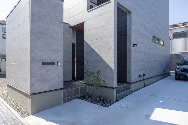長方形を重ねたデザインが特徴的なシックでモダンな外観は、スタイリッシュな雰囲気を演出してくれます。落ち着いたグレーは自然と調和し、木目の玄関扉や植栽を引き立てます。窓や採光開口部を取り入れることで、温もりを感じられるつくりに仕上がりました。