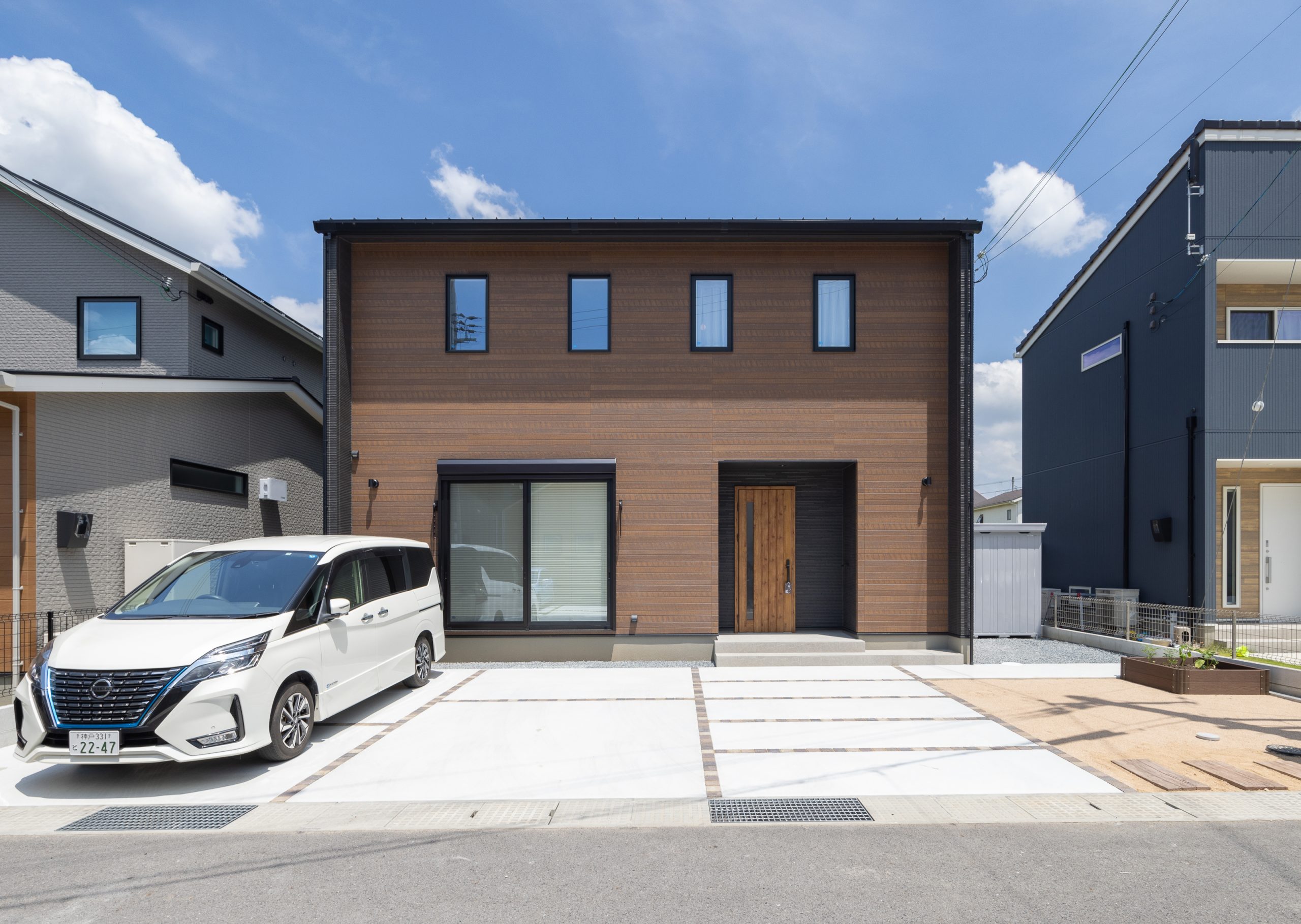 キリッとした長方形の外観が特徴の住宅です。周囲の三角屋根の家とは一線を画し、通行人の視線を引きつけます。ブラウンとチャコールグレーの温もりのある組み合わせが、落ち着きと安心を感じさせるでしょう。