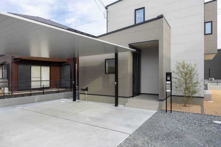 シャープな三つの切妻屋根が印象的な外観デザイン。黒を基調とした外壁に木目の玄関ドアが映え、シンプルながらも個性が際立つ佇まいに仕上がっています。カーポートや外構も建物と調和し、実用性と美しさを兼ね備えたデザイン。都市の街並みにも馴染むスタイリッシュな一邸です。