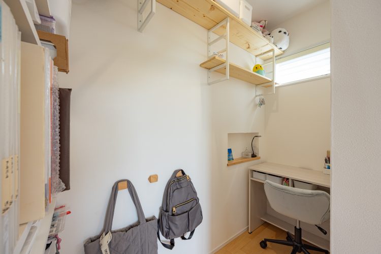 リビング横など目の行き届く範囲にスタディスペースを設けることで、子どもの勉強や大人の作業に便利な場所ができます。家事をしながら子どもを見守ることができ、コミュニケーションが取りやすいのもメリットです。壁付けカウンターを設置すれば、学用品の収納が簡単で片付けやすく、常にスッキリとした空間を保てるでしょう。