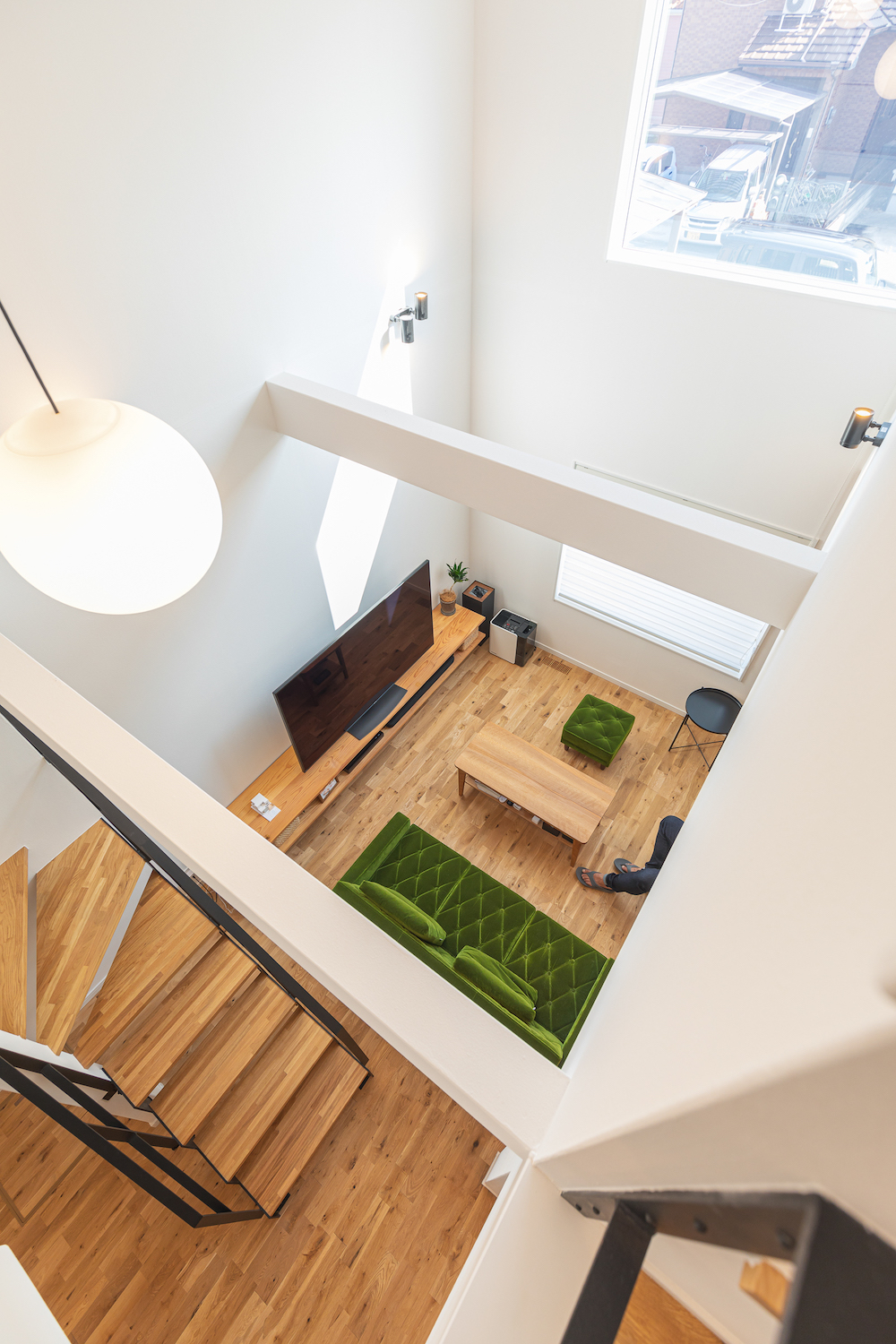 吹き抜けのある開放的なリビングは縦に広がる空間が特徴で、採光や通風にも優れています。リビングには2階へつながる階段があり、子どもが自分の部屋を使うようになっても家族が自然に顔を合わせられる設計です。