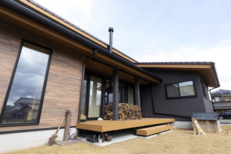 のどかな自然の中に佇むスタイリッシュな平屋住宅は、ログハウス風の内装が魅力です。無垢材をふんだんに使用し、木の温もりが感じられる空間に仕上げました。薪ストーブを設けたリビングは、家族が集まる温かな憩いの場となっています。また、隠す収納と見せる収納をバランスよく取り入れたことで、機能性とデザイン性を両立したメリハリのある収納空間を実現しています。