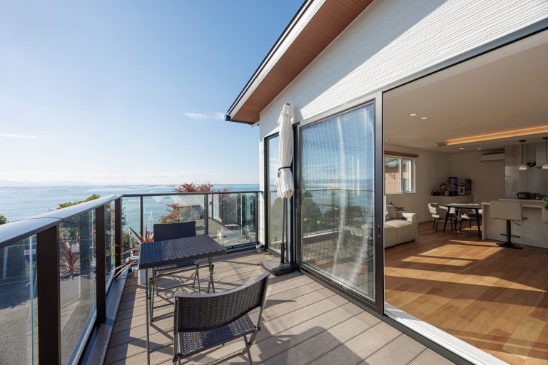 海を一望する絶好の立地に建つのは、リゾート感漂うモダンな住まいです。大きな窓とバルコニーからは、海風を感じながら移りゆく景色を楽しめます。室内にも開放感を持たせ、リビングからの眺望も抜群です。バルコニーへとつながる大きなガラス窓が、外との一体感を生み、自然と調和した心地よい空間を演出しています。海辺の暮らしを満喫できる、理想的な住まいです。
