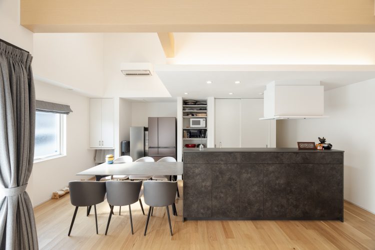 グレーとブラウンの2色の外壁が印象的な、平屋の事例です。天井の高いLDKは開放感があり、畳スペースや愛猫のためのキャットタワーを設置し、家族全員がゆったりと過ごせる空間になりました。シンプルなアイランドキッチンは、家事の効率化に一役買っています。
