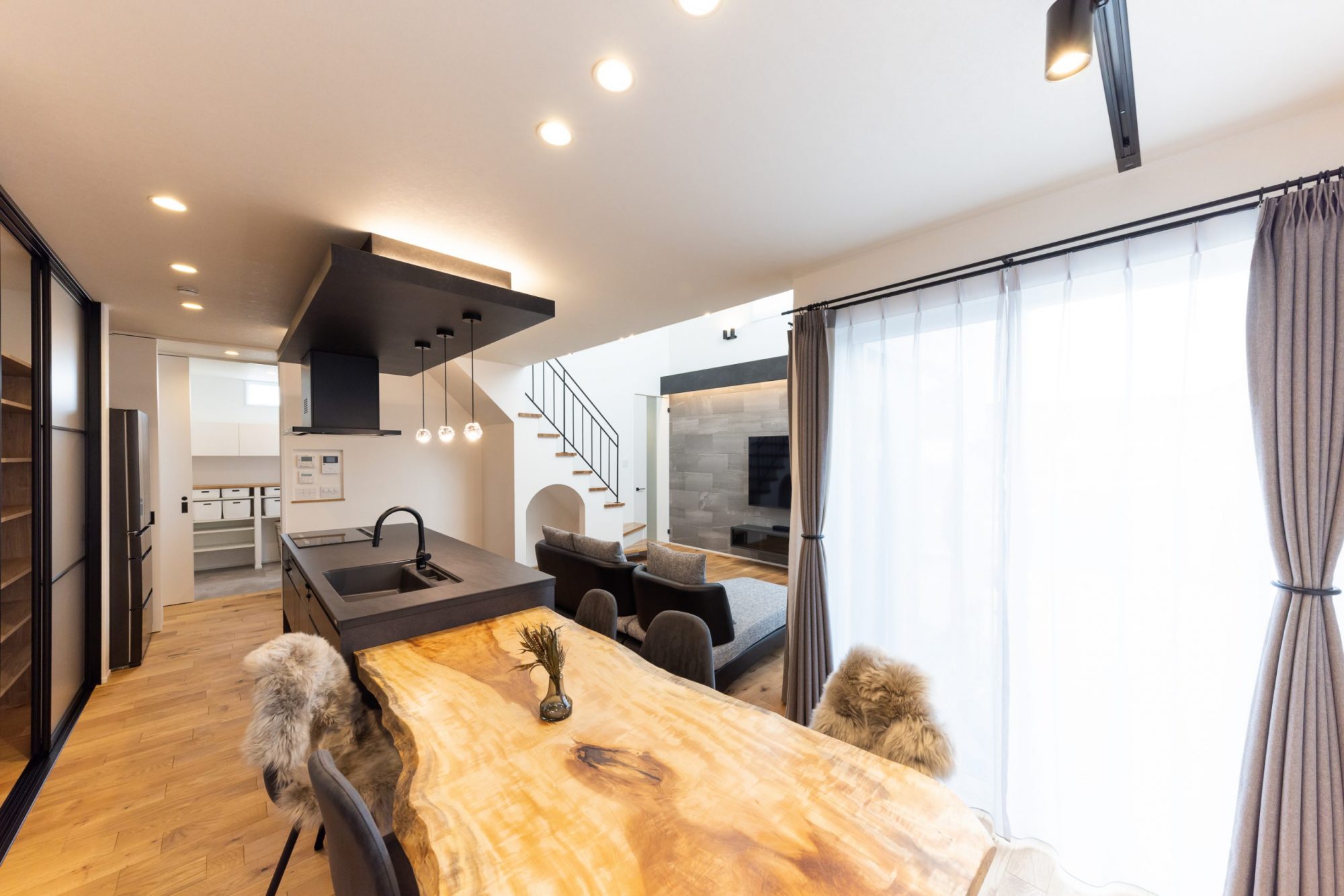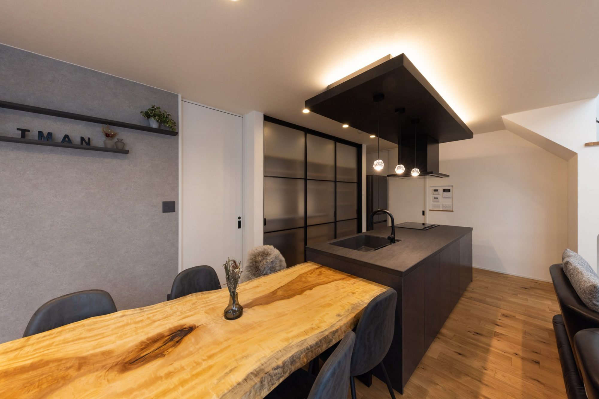 キッチンの正面に居住スペースのある2階への階段をとることで、料理をしているときでも、家族が帰ってきたら必ず顔を合わせられ、自然とコミュニケーションが生まれる住まいに。