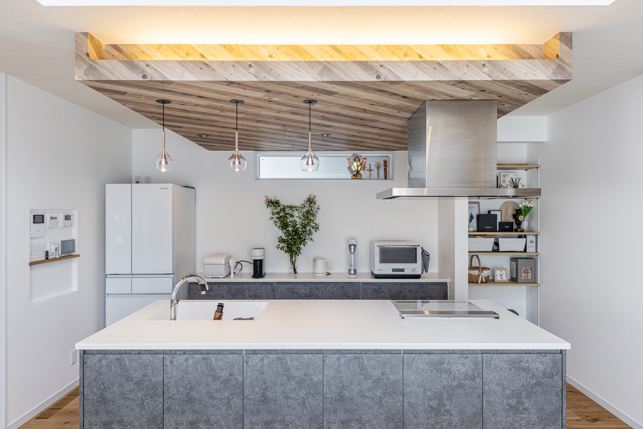どこかしらには閉塞感を感じてしまいやすい平屋建てでも開放感を感じられるよう、LDKは勾配天井とキッチン上の下がり天井をご提案し、約19帖という平面的な広さだけではなく、天井高の違いによる立体的な広さも感じられる空間に。