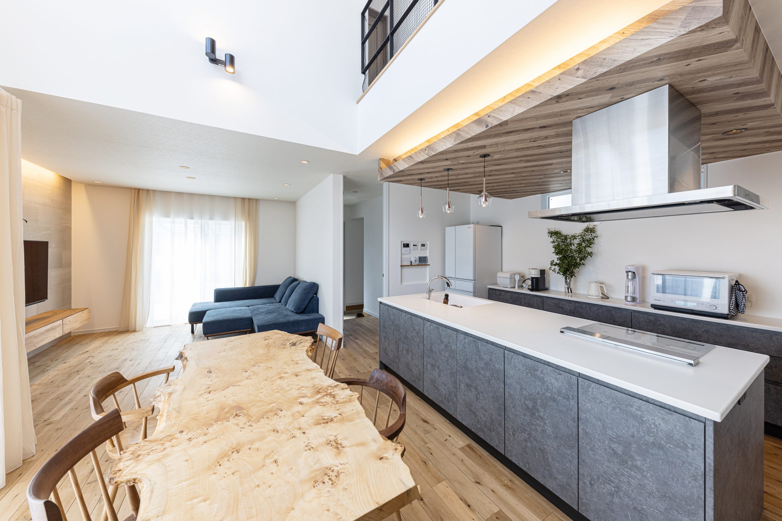 生活の中心になるLDKは、約21帖と広々とした空間である上、6帖ほどの吹き抜けがあり、開放感を感じられる空間でありつつ、お家全体の空間を繋げる大事なアクセントにも。