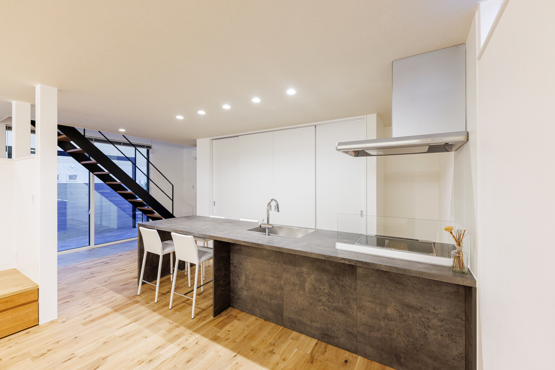 大空間を引き締めるアクセントになってくれているのは、キッチン前につくったモールテックス仕上げのBARカウンター。