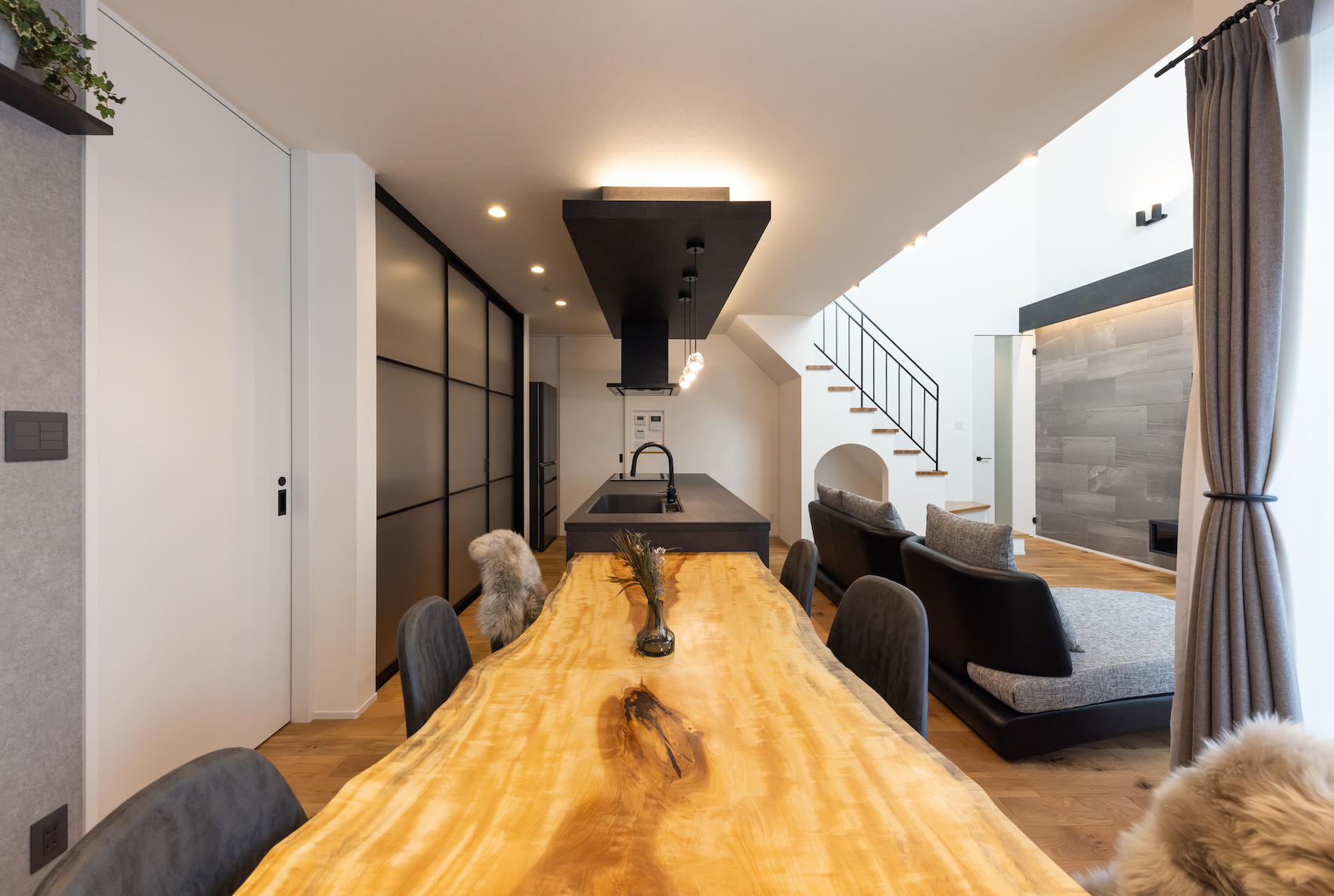 「開放的に感じられる室内にしたい」というオーナー様の想いを、天井高とハイドアの使い方で実現した2階建ての住まい。
