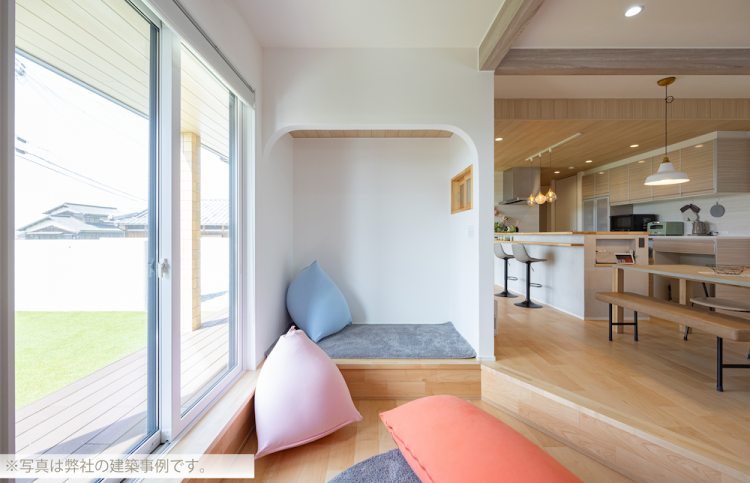 吹抜けがあることで、より明るい空間になったLDK。 前述のピットリビングとの相乗効果でより開放感を感じられる住まいになりました。