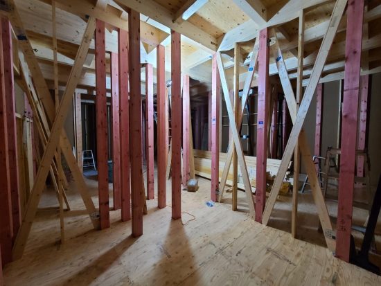 「木造住宅で柱や梁などの建物の基本構造が完成した後に、