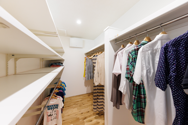 また、ランドリールームの近くにウォークインクローゼットを設けました。ハンガーや枕棚をたくさん用意してあるので、1年分の家族の分の衣類を収納できます。衣替えや洗濯物を家族それぞれの部屋にしまう必要がないので、洗濯の家事負担を大きく減らせます。