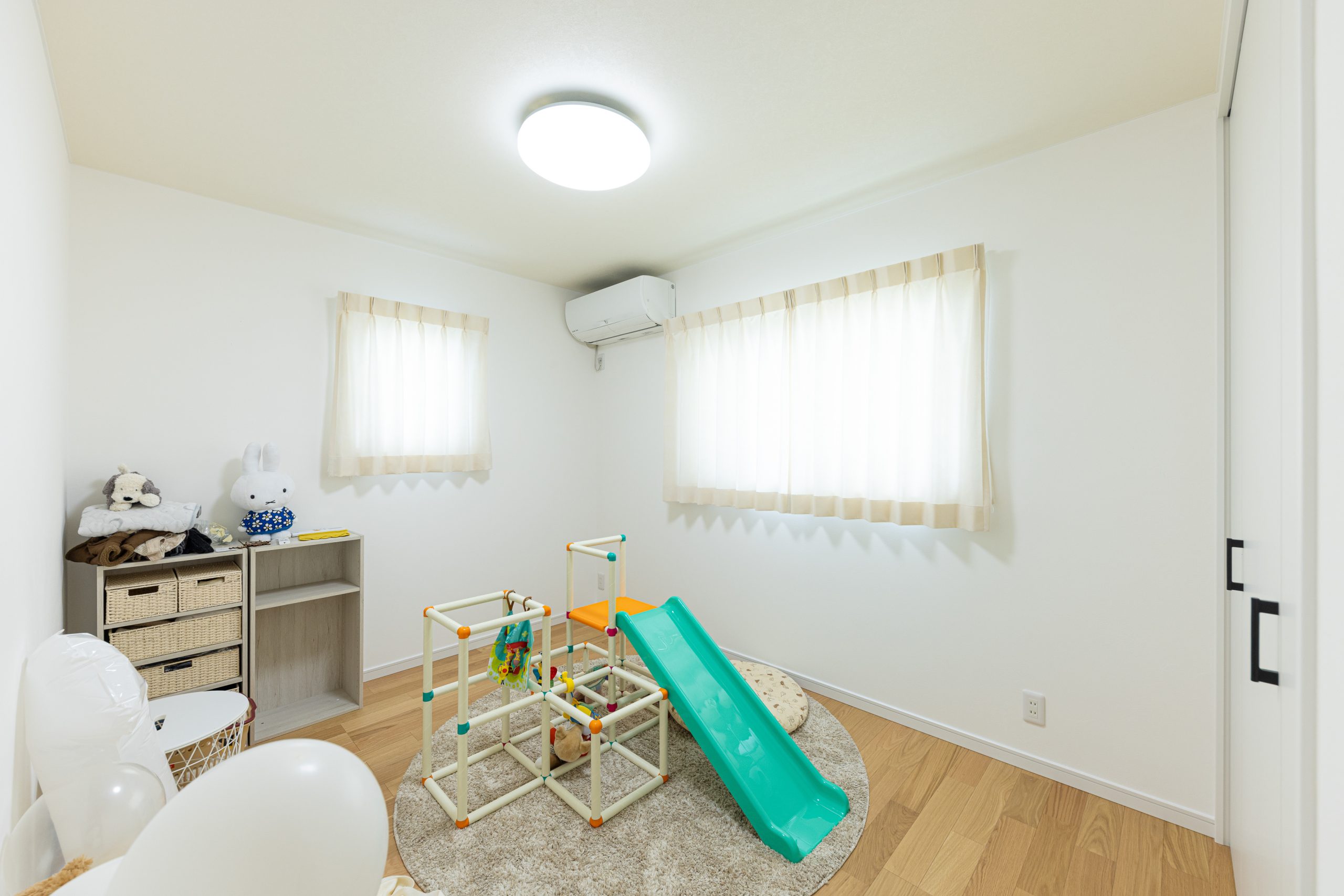 最後に紹介する階段下スペースは、子供部屋です。窓から光が入り明るい部屋になるように設計しました。さらに、白い漆喰の壁でフォトスペースも作成し、家族の思い出を作る部屋になりました。