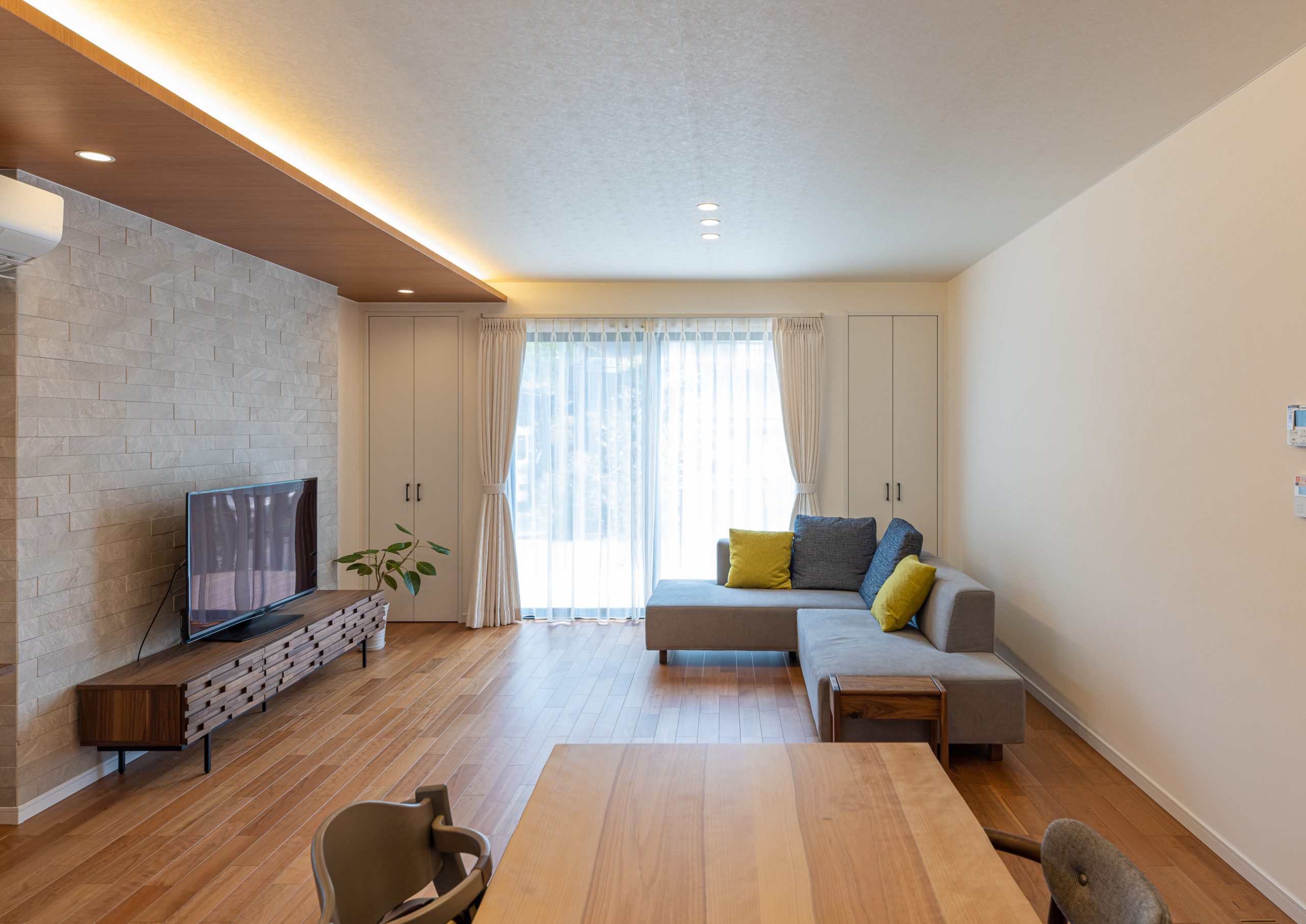 今回紹介する事例は、間接照明が彩るナチュラルモダンな2階建てです。昼間は電気をつけなくても明るい家にしたい、家事と育児が両立しやすい環境にしたいなど、さまざまなこだわりを詰め込んだ住まい。オーナー様ご夫婦に家づくりのきっかけや要望を伺うとともに、お家の特徴をご紹介します。