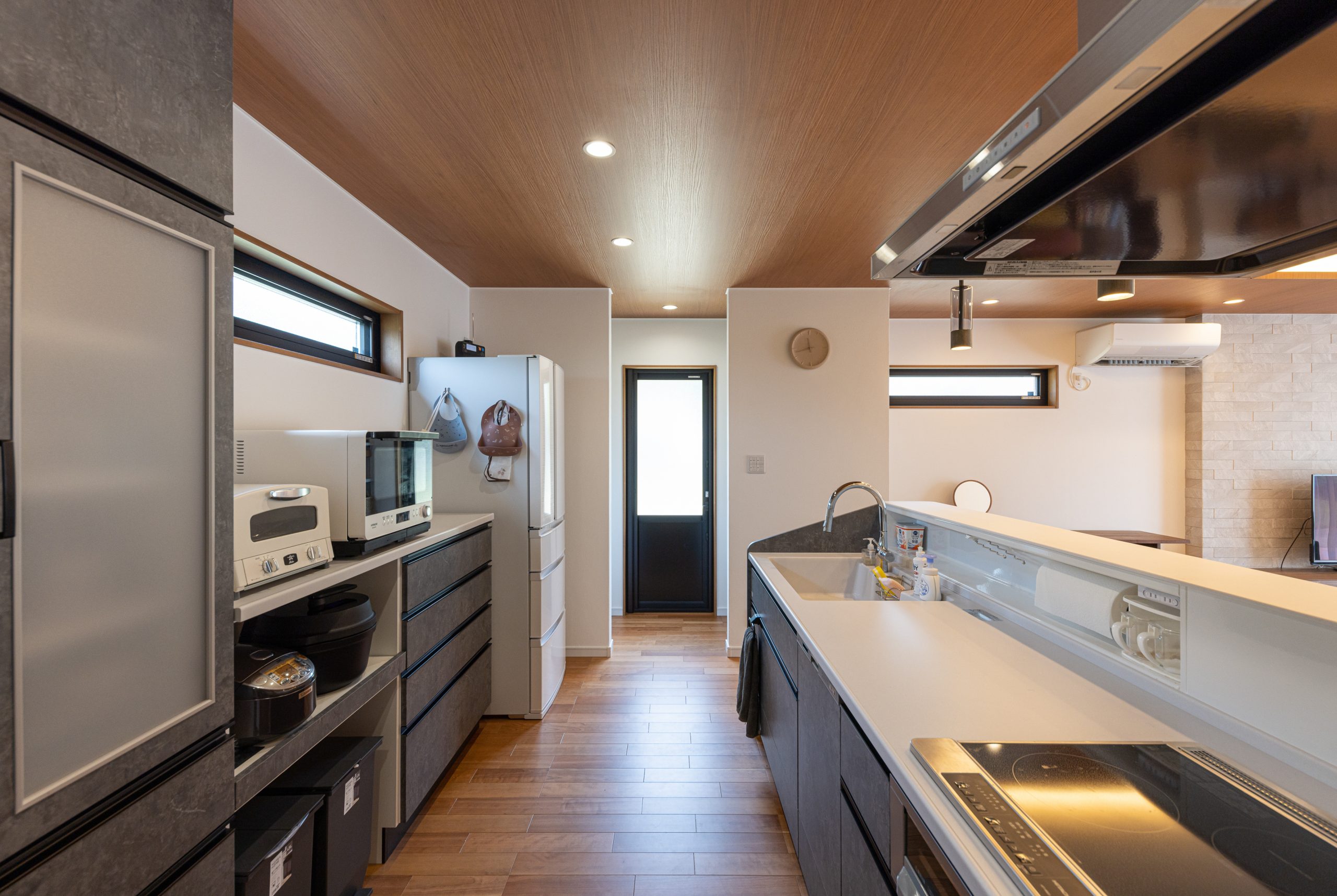 さらに、グレーで統一感があり、高窓で昼間は明るい空間になっています。キッチン横に奥行きのあるパントリーも設置しているので、ストックもたくさん置くことができます。