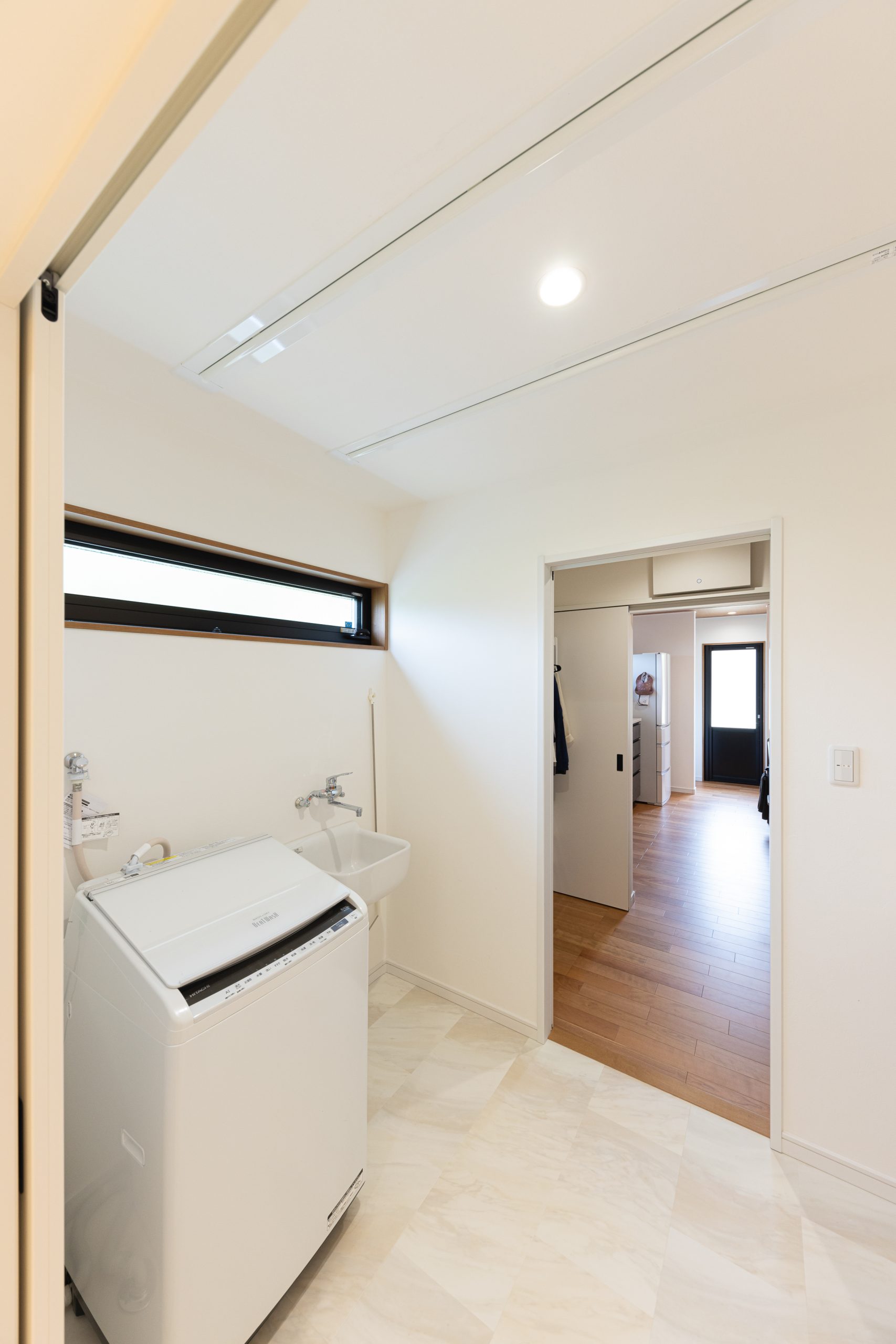 続いて紹介するのは、ランドリースペースです。ランドリースペースからファミリークローゼットを通ってキッチンに。洗濯した衣類をすぐに片づけできる動線が魅力です。