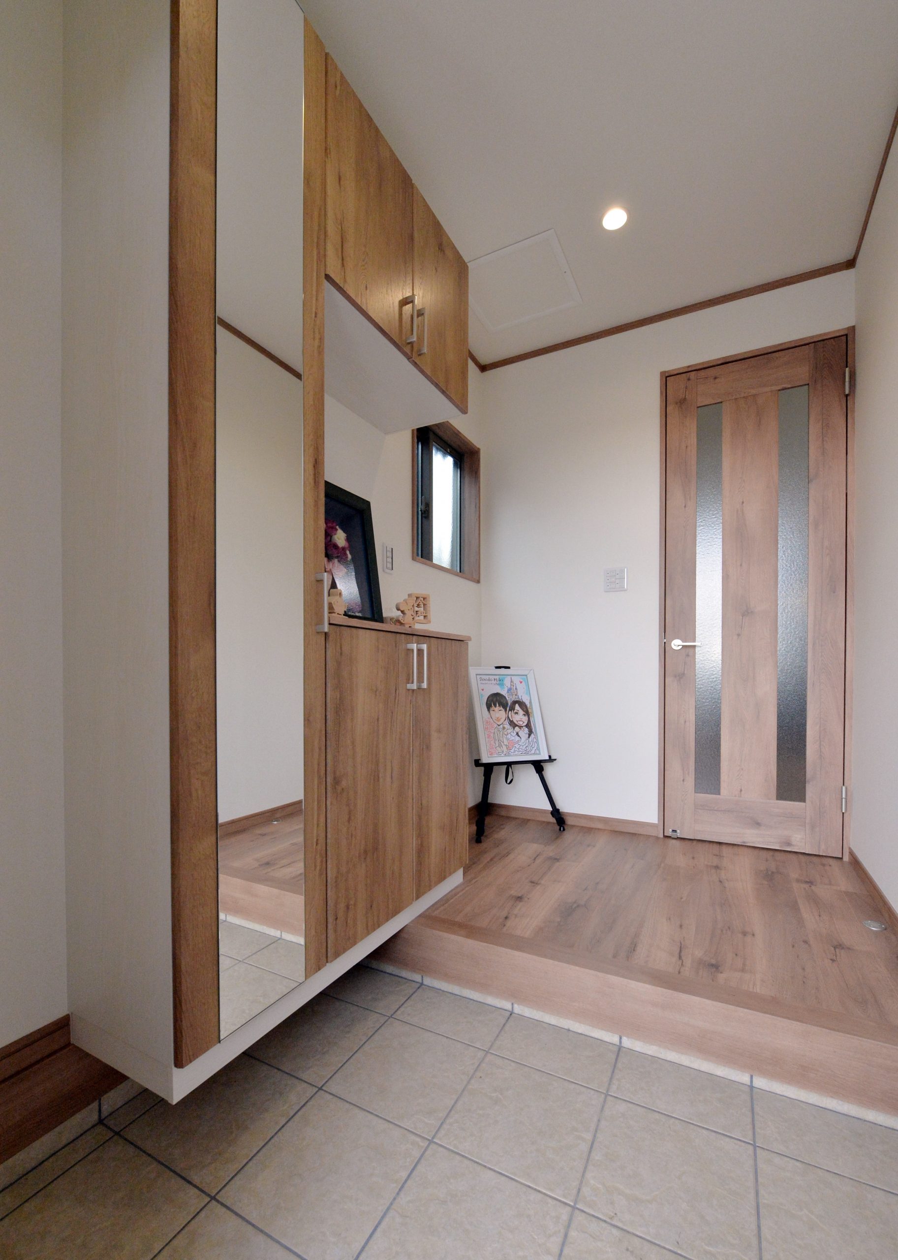 玄関には大きな姿見を設置し、家を出る前に身だしなみをしっかりチェックできるように。さらに、広い土間と大容量の収納を備え、靴やアウトドア用品などをすっきり収納できるため、玄関が散らかる心配がありません。
