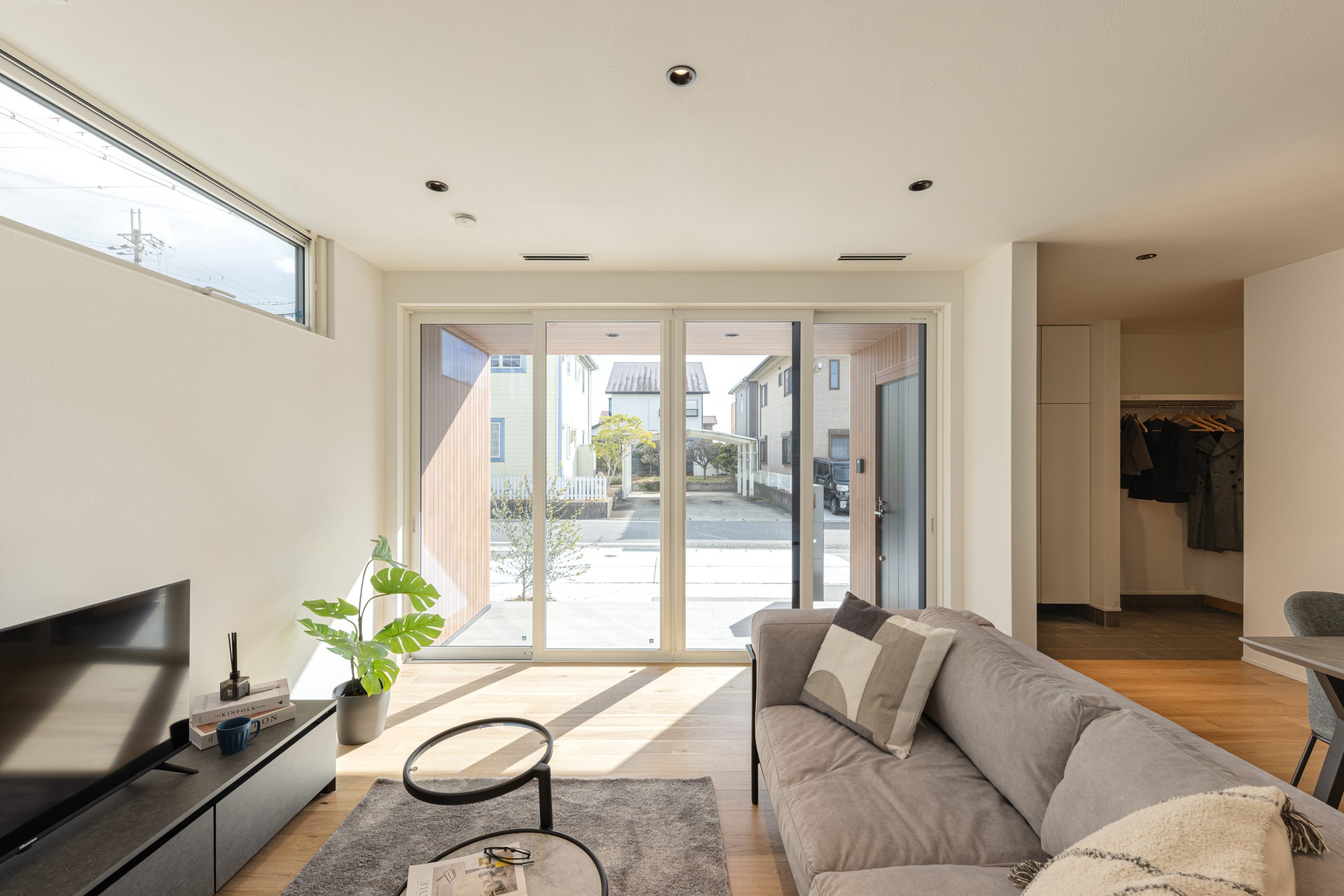 次に紹介するお家の特徴は、高窓と大きな窓で明るいLDKです。グレー、白、ナチュラルカラーで統一され、シンプルで落ち着いた空間が広がっています。また、見せる収納と隠す収納がうまく組み合わさり、スッキリとした印象を与えています。リビングにはワークスペースや勉強ができるカウンターも配置され、家族のライフスタイルに合わせた機能性も充実しています。