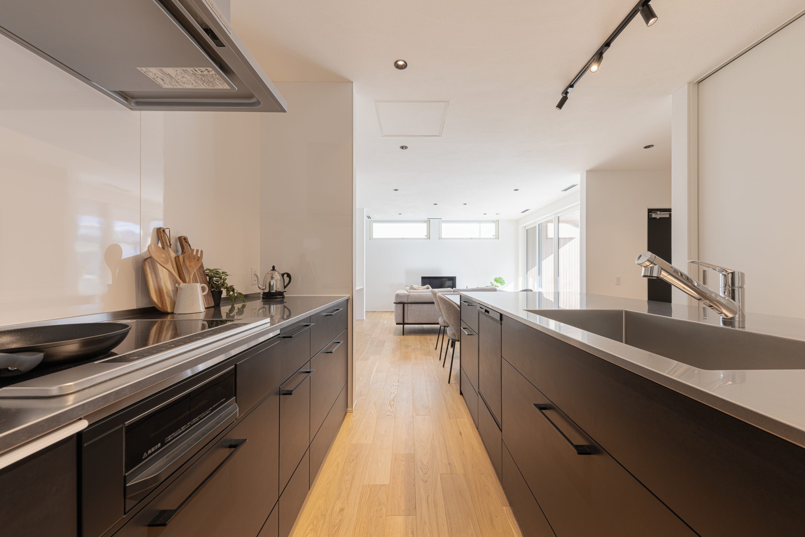 続いて紹介するお家の特徴は、黒を基調としたキッチンにシルバーの天板がアクセントとなり、スタイリッシュで洗練されたデザインです。シンプルな照明が空間を演出し、落ち着いた雰囲気を作り出しています。キッチン収納も十分に備えられており、使いやすさが考慮されています。さらに、キッチン横にはパントリーが配置されており、ストックをたくさん置ける便利なスペースも確保されています。