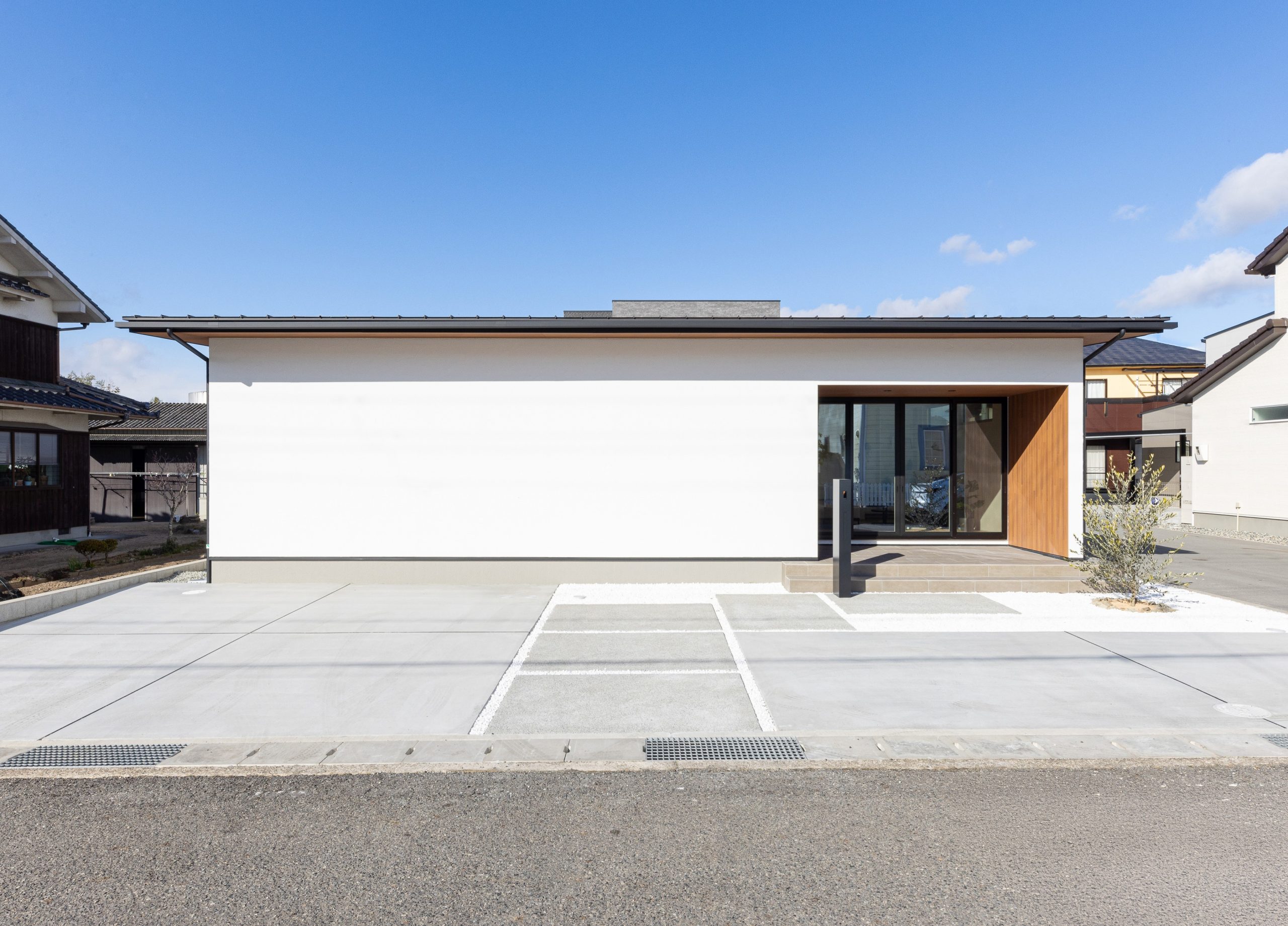 はじめに紹介するお家の特徴は、白を基調とした外観にブラウンの差し色がアクセントとなり、シンプルでありながら温かみのある印象を与えるデザインです。玄関ポーチは広々としており、落ち着いた空間が広がります。ポーチと窓で繋がるLDKは、自然光がたっぷりと差し込み、心地よい空間を作り出しています。ドアは黒で引き締め感を与え、全体のバランスを保っています。周囲の緑が映え、外観に自然との調和が感じられます。