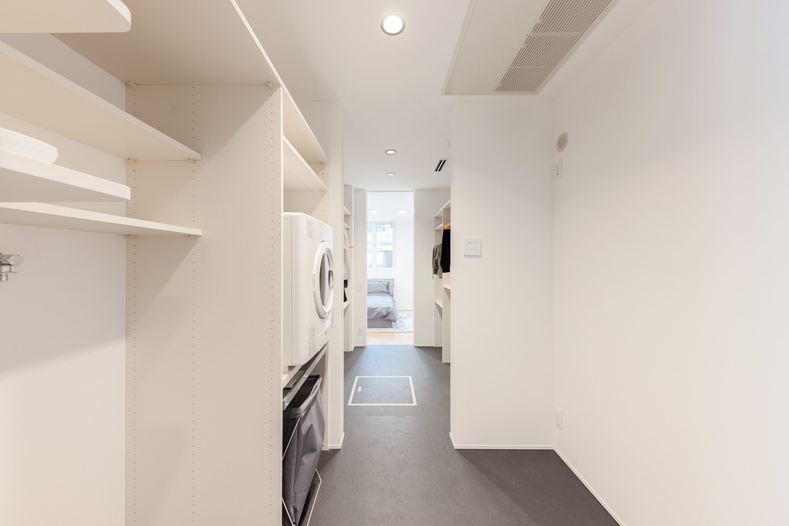 次に紹介するお家の特徴は、寝室から一直線で繋がっており、寝る前や起きてからの準備がスムーズに行える設計になっています。お風呂から洗う・乾かす・しまうまで一括でできる動線が確保され、家事の効率化が図られています。