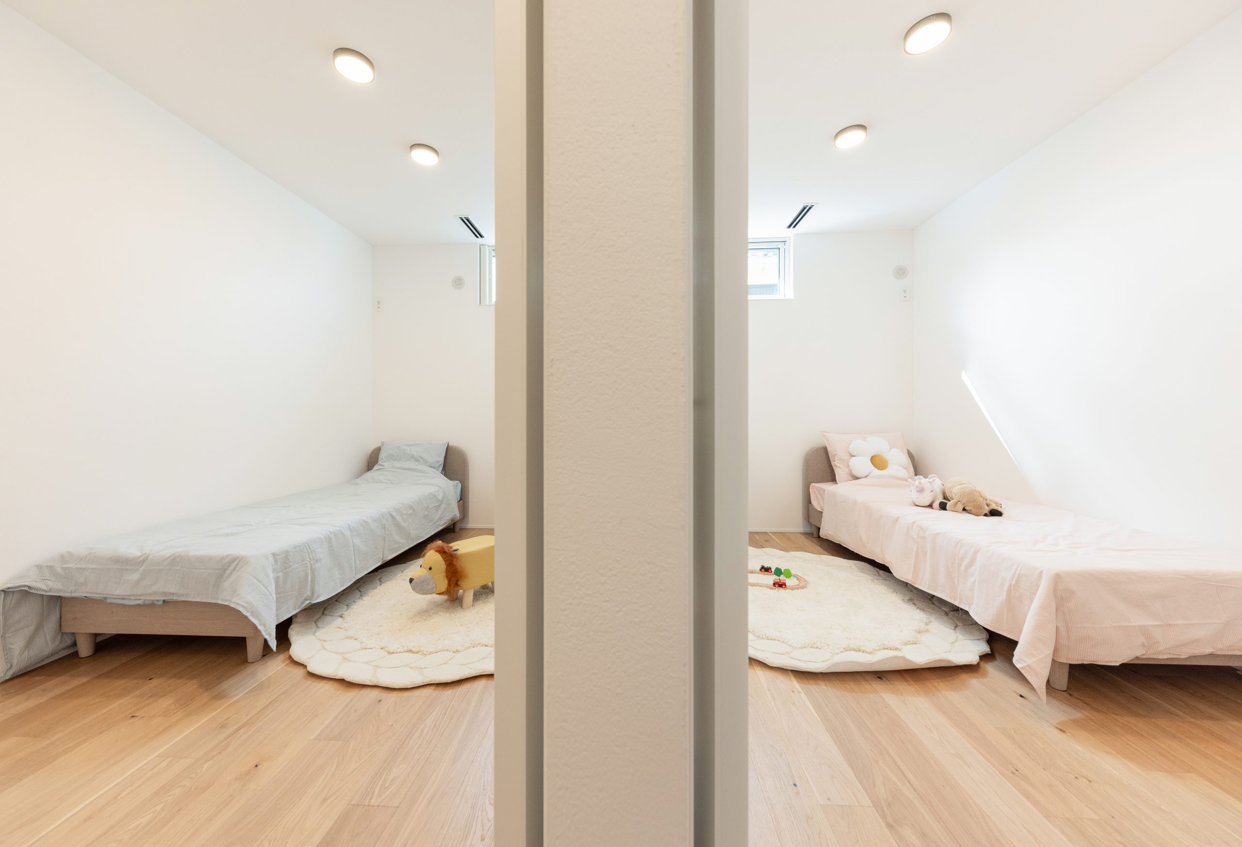 最後に紹介するお家の特徴は、横並びに配置された2つの子供部屋です。各部屋には高窓が設置され、自然光がたっぷりと差し込む明るい空間が広がっています。シンプルなデザインで、机とベッドが置かれた空間は、使いやすさと快適さを兼ね備えています。