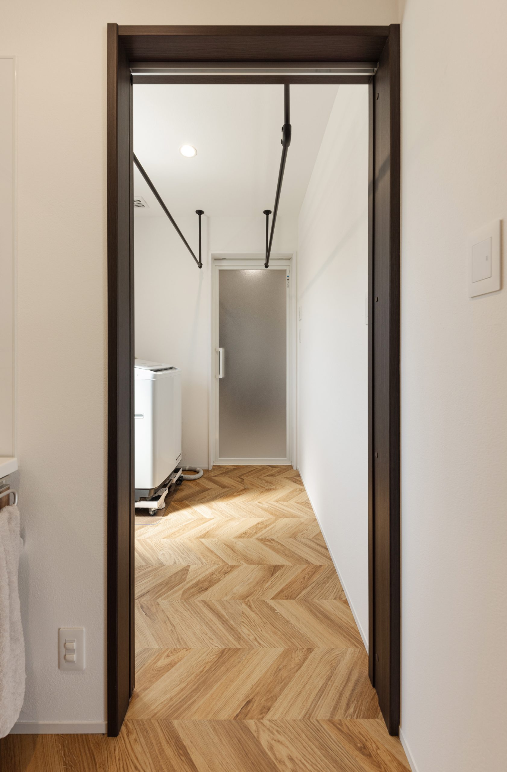 洗面室から洗濯機、物干し、収納までが一直線につながる、無駄のない動線設計。