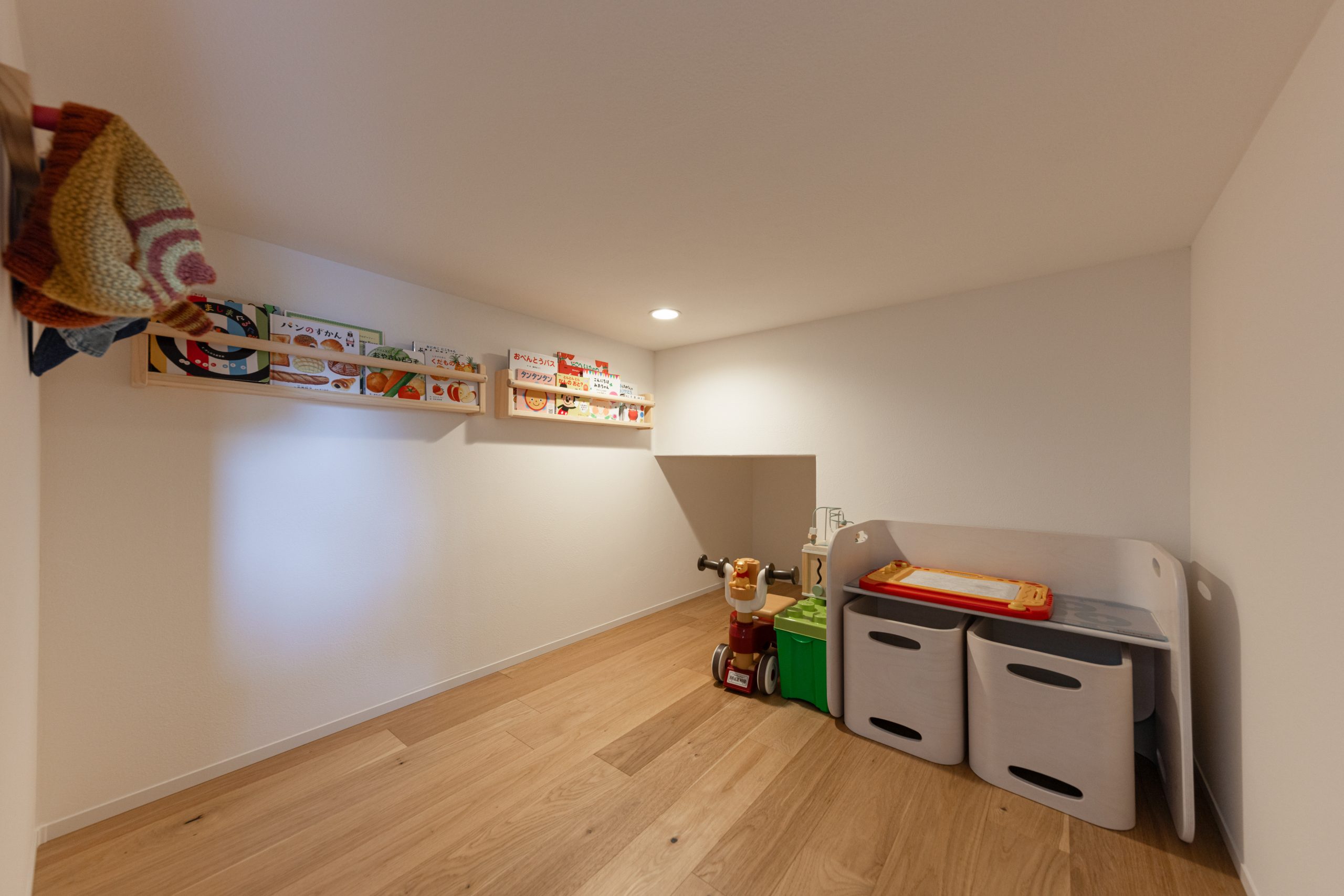 小さな身体にちょうどいい天井高と、絵本やおもちゃを収納できる棚を備えた空間は、子どもたちのお気に入りの場所に。
