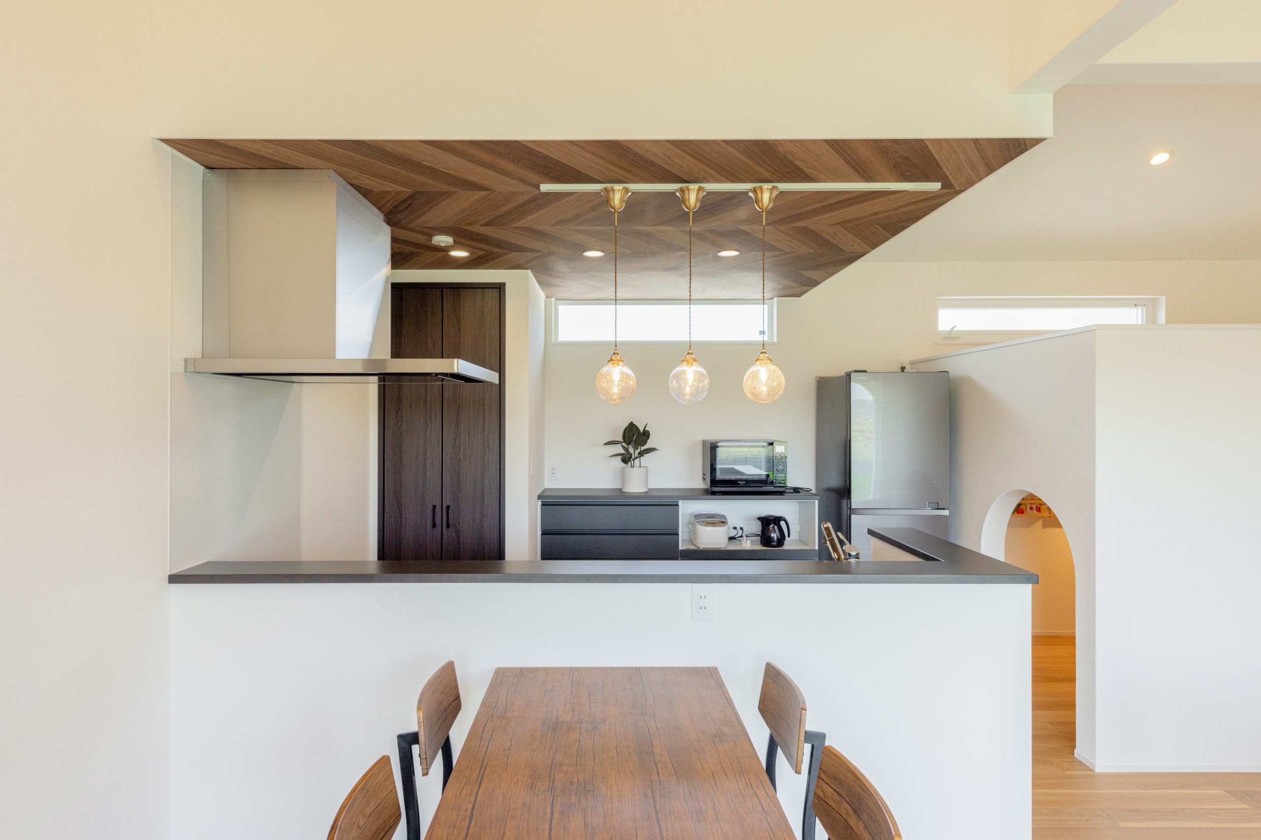 次に紹介するお家の特徴は、印象的なヘリンボーン柄の木目天井とガラスペンダント照明が彩る、洗練されたキッチンです。