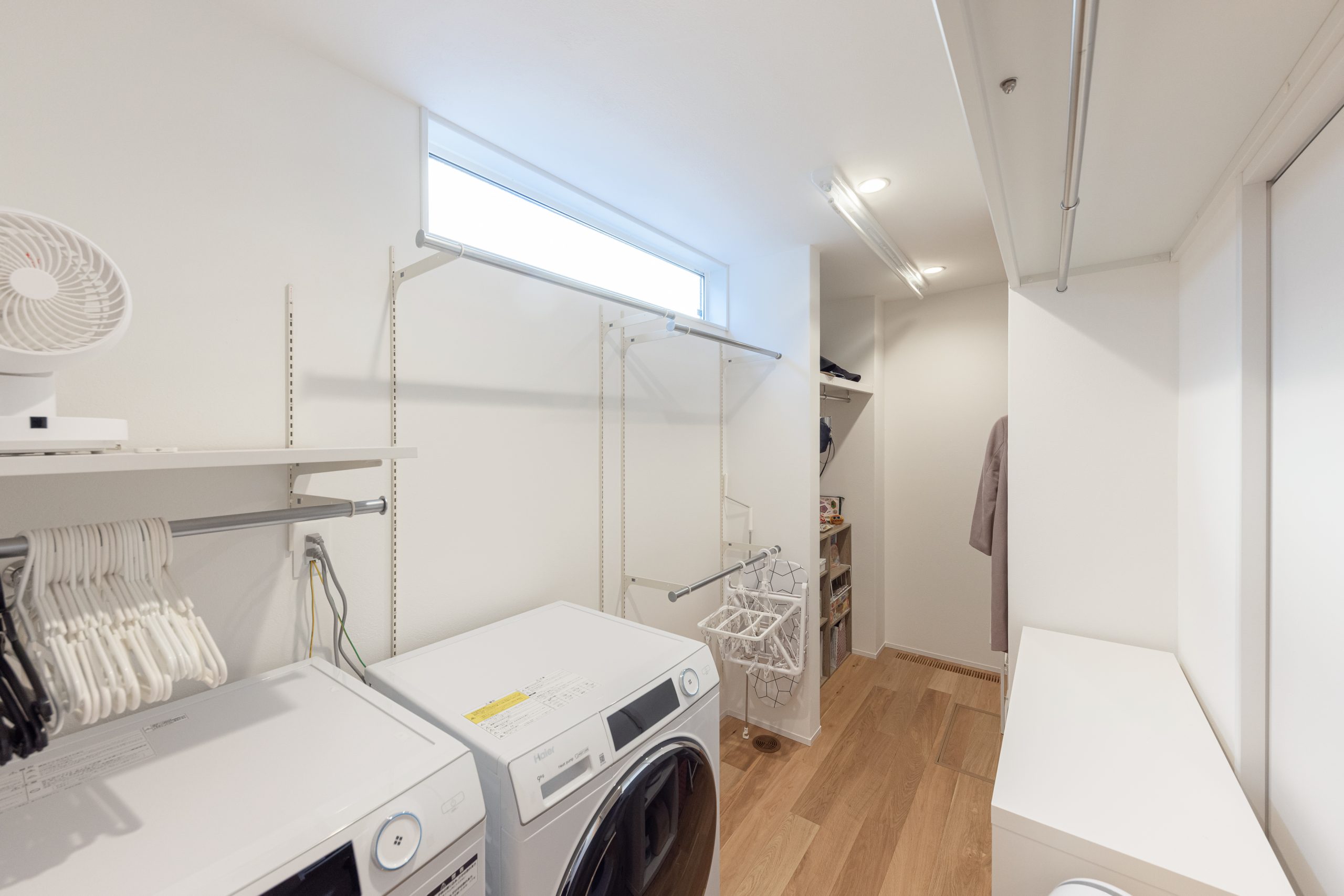 干したままでも動線を妨げない設計で、家事の負担をぐっと軽減。すぐ近くにクロークを設けたことで「洗う・干す・しまう」が完結。毎日の洗濯が、無理なく心地よく続く空間になりました。
