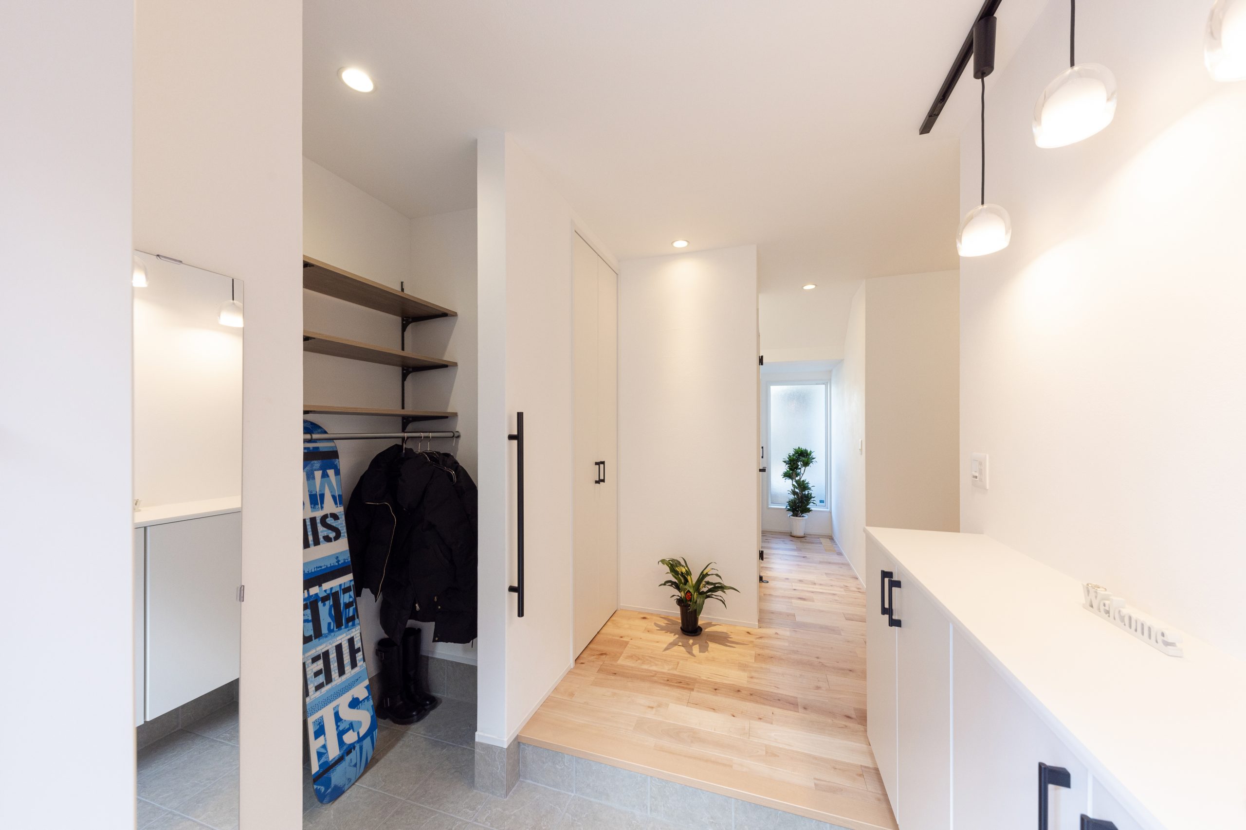 目に入る場所にはインテリアとしても映える照明やグリーンを配置し、毎日の「ただいま」が気持ちよくなるような、開放感あふれる玄関まわりに仕上がりました。