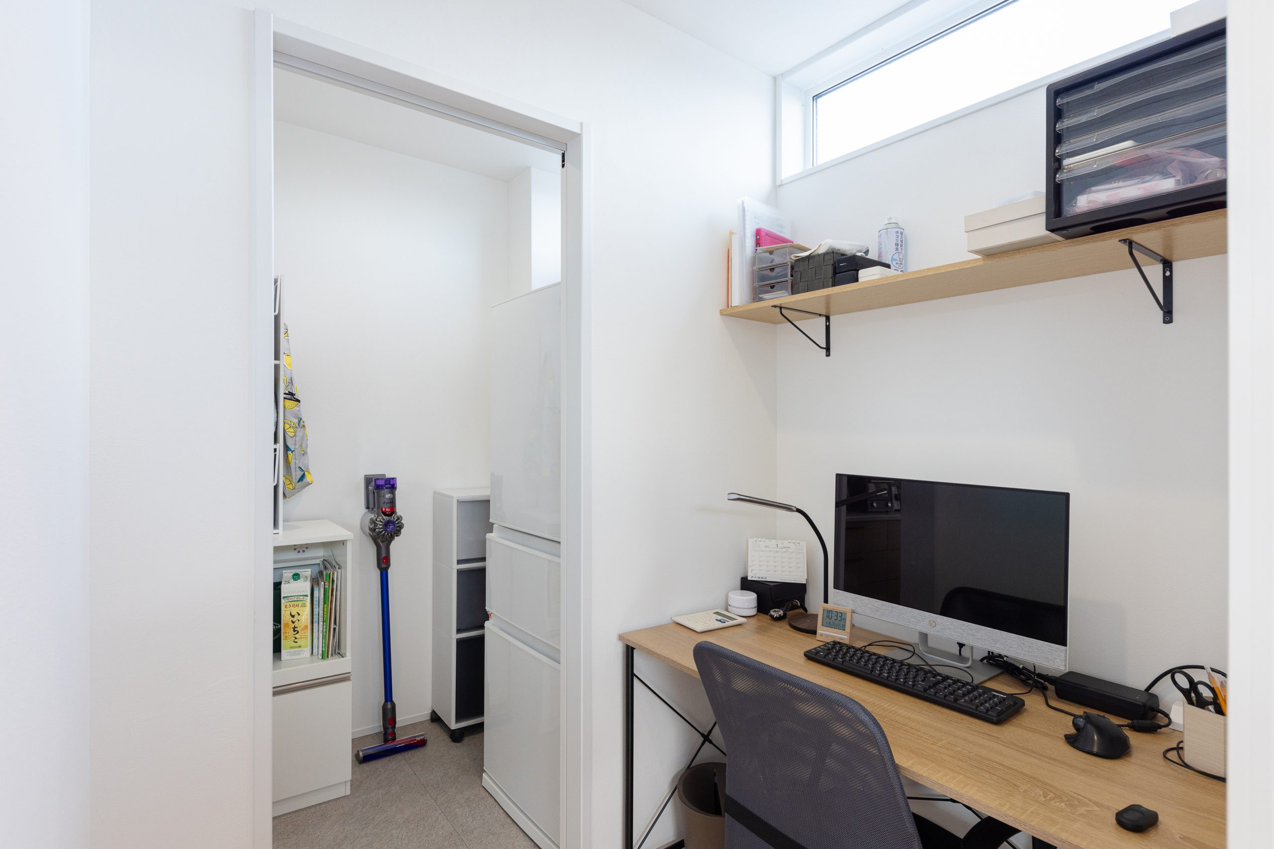 自然光が入る高窓や壁面収納を備え、限られた空間でも快適に作業ができます。